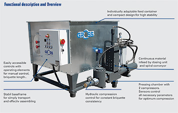The material to be processed is fed into the container either manually or by way of a filter or conveyor belt. The permanent mixer and a separately controlled discharge screw-transport feed the material into the press chamber. The material is prepressed and then compressed in the main pressing procedure without the aid of binding materials.
